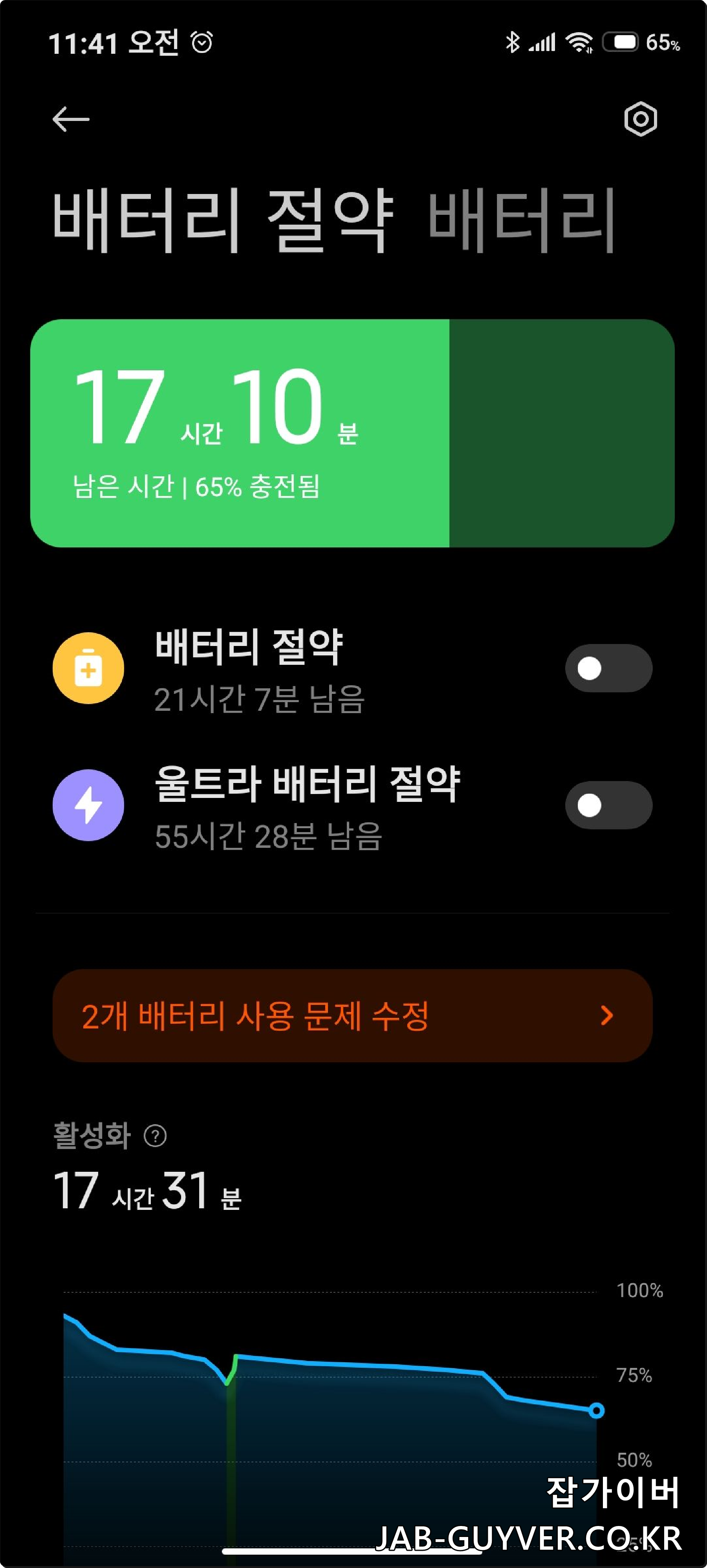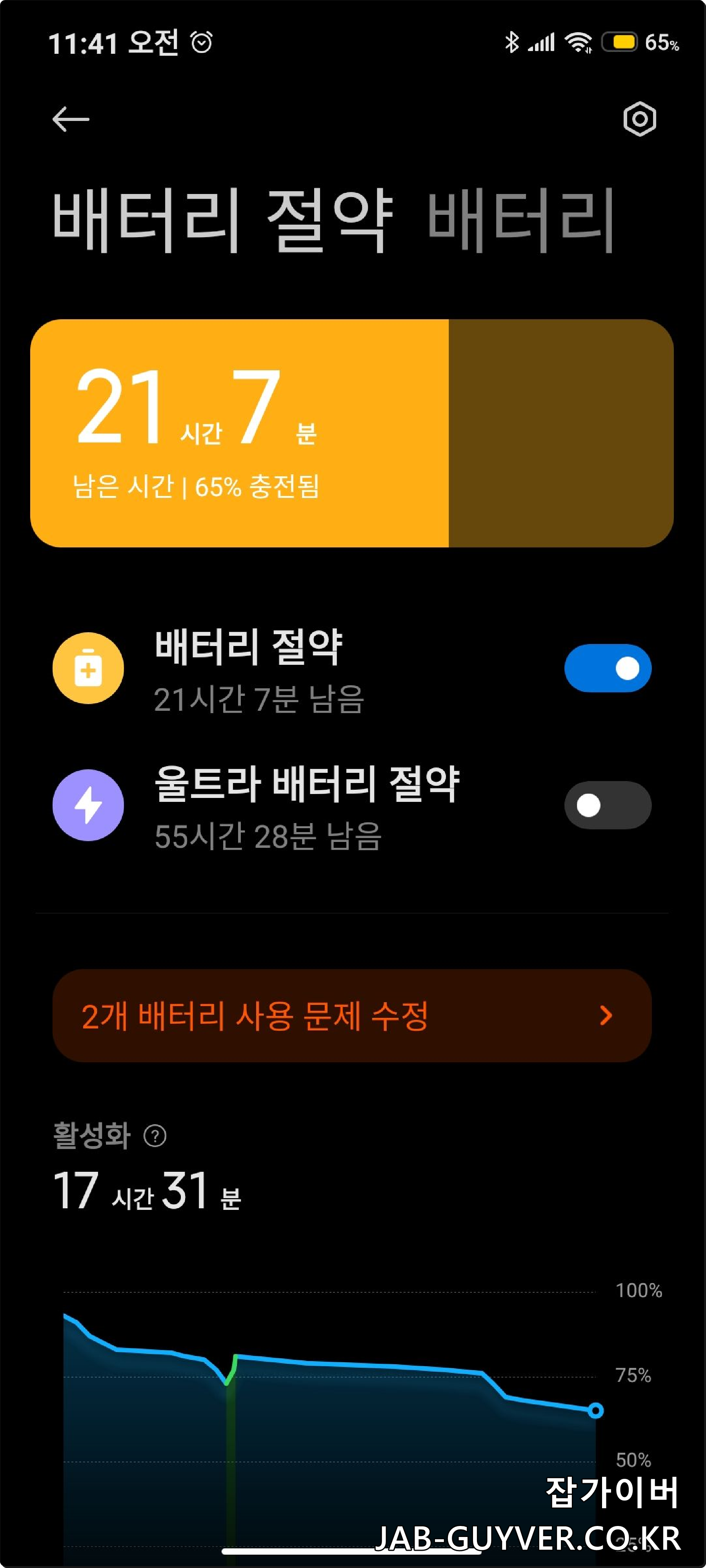 영상 시청, 지도 사용 같은 고전력 작업이 많다면 평소에는 절전모드를 켜두고 배터리가 정말 부족할 때는 울트라 절전모드로 전환해 응급 상황을 대비하는 것이 좋아요.