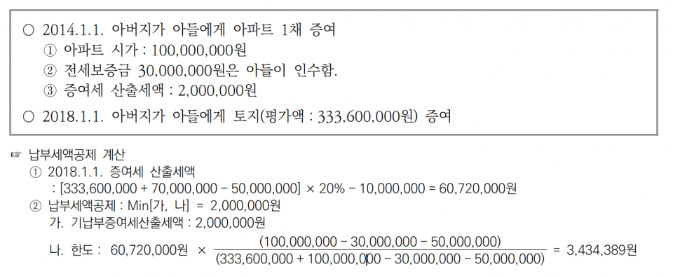 한편 집행기준 58-0-2는 국세기본법상 제척기간 만료 등으로 증여세를 아예 부과할 수 없는 증여재산에 대해서는 납부세액공제를 적용하지 않는다고 정합니다. 집행기준 58-0-3은 이러한 납부세액공제와 관련된 구체적인 사례를 제시하면서 실무상 판단을 돕습니다.