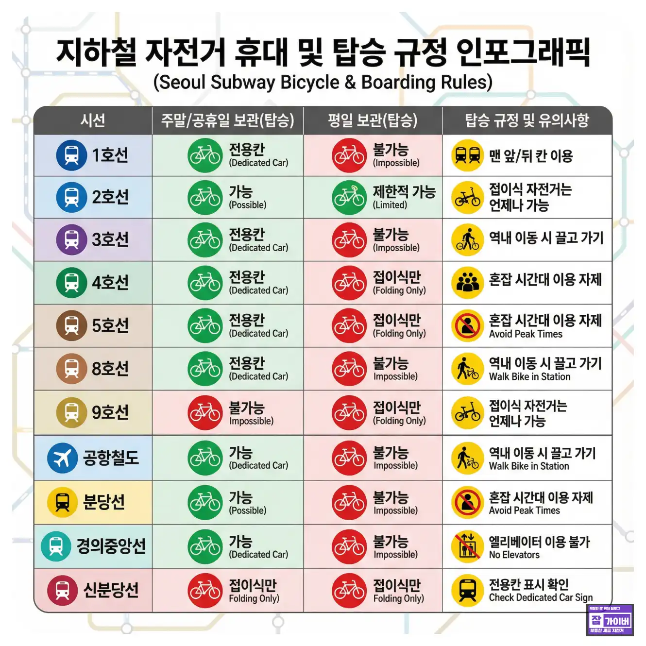 | 일반 자전거 | 주말·공휴일 중심, 또는 일부 노선의 비혼잡 시간대 | 평일 출퇴근 시간 제한, 노선별 요일 제한 | 맨 앞·뒤 칸 아닌 곳에 두거나, 승객 동선 방해 |
