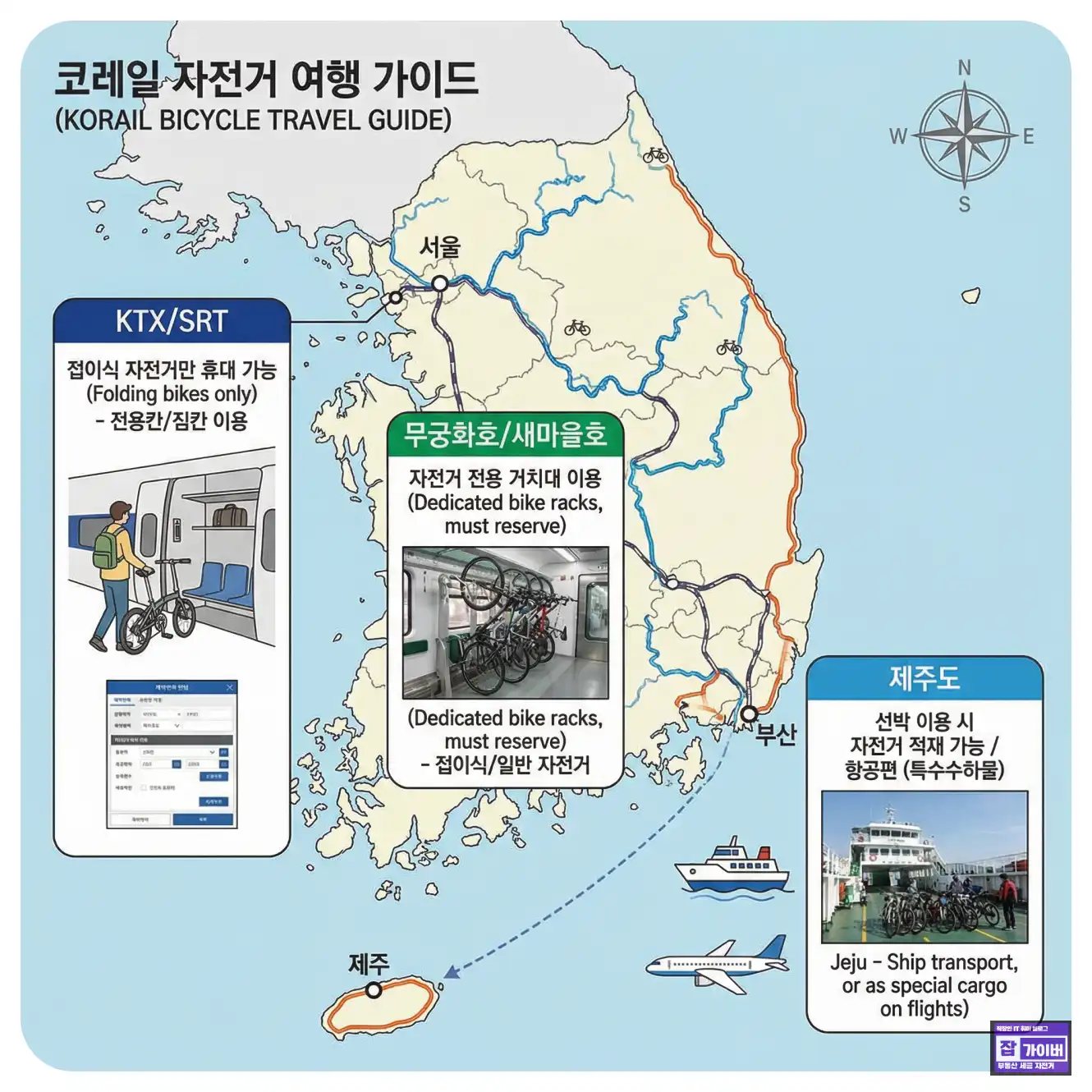 | KTX (KTX-산천 포함) | 없음 | 접이식은 접은 상태로, 일반 자전거는 분해 후 전용 가방에 넣은 형태 중심 | 자전거 전용 좌석은 별도 운영하지 않는 편(좌석 요금 외 추가 없음) | 통로/좌석 공간을 차지하면 제지될 수 있어 가방(캐링백) 형태가 가장 무난 |