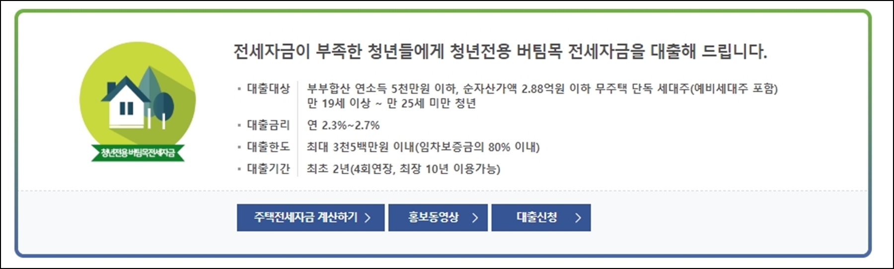 | 대출대상 | 부부합산 연소득 5천만원 이하, 순자산가액 2.88억원 이하 무주택 단독 세대주(예비세대주 포함) 만 19세 이상 ∼ 만 25세 미만 청년 |