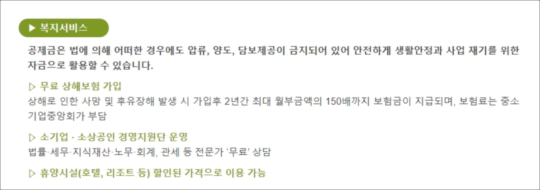 또한 부금 납입기간 12개월 이상일 경우 무담보,무보증으로 납입부금 90% 한도내 저리대출이 가능하고 공제가입 후 2년 내 가입자의 상해사망 및 상해후유장해 발생 시 부금월액의 최고 150배까지 보험금이 지원되는 등 다양한 부가서비스를 제공하고 있으니 사업자라면 충분히 검토를 해보고 가입을 권해보길 권합니다.